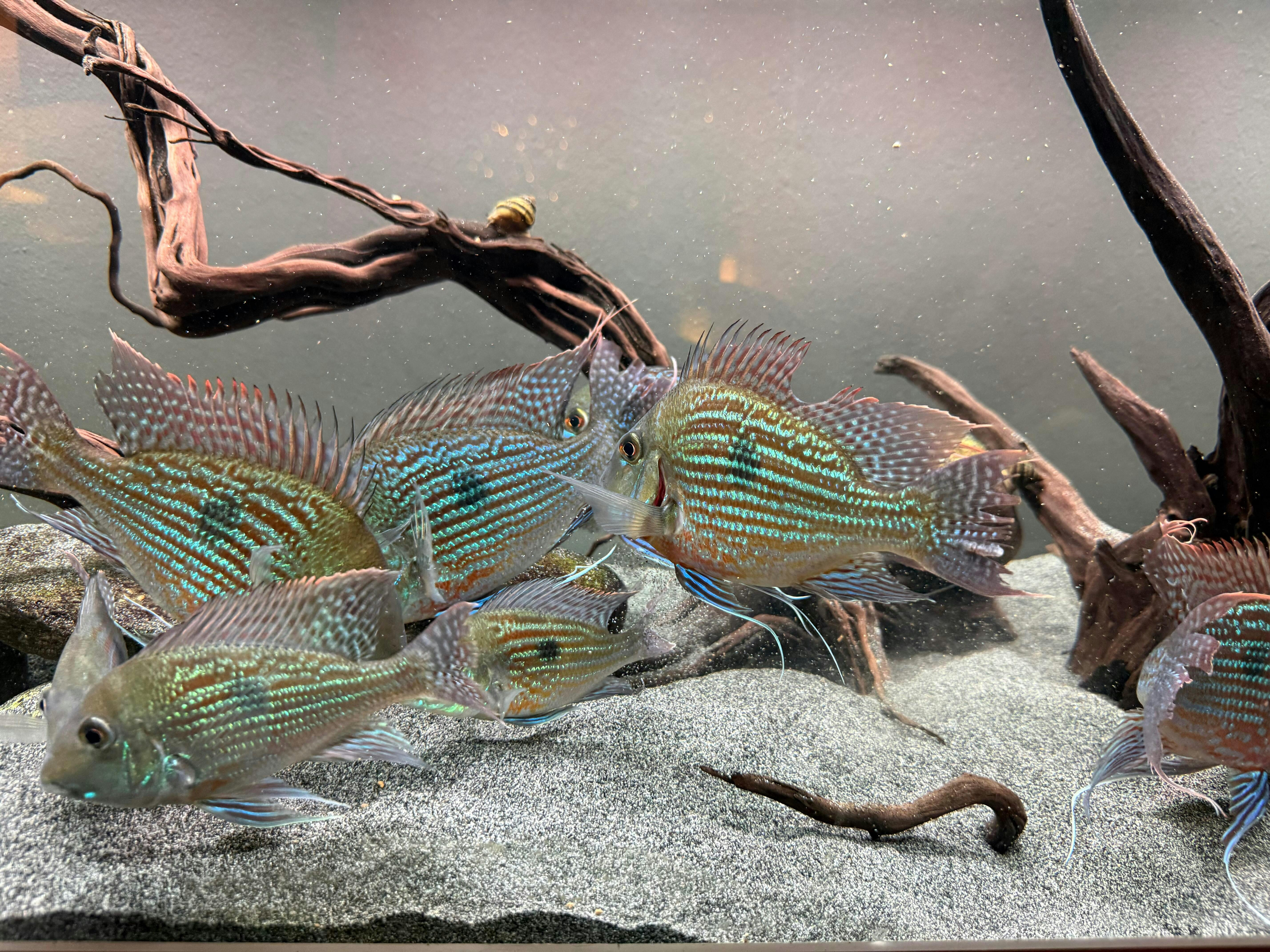 Svenis zählt mir 20-25 cm zu den etwas "kleineren" Geophagus. Die Haltung in Gruppen entspricht dem natürlichen Sozialverhalten und ist anzuraten. Als eine der wenigen Buntbarschen Südamerikas sind Geophagus Maulbrüter und damit interessante Pfleglinge.