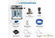 Lieferumfang 500 cm Schlauch 1/4", T-Stück 3/8“ - 3/8“ - 1/4“ inkl. Ventil, Wasseranschluss 3/4“ – 1/4“, Absperrventil 1/4“ – 1/4“, Netzteil, Abwasserschelle, 2x Filterschlüssel (klein und groß)